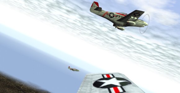 Now speaking of keeping an eye on things - and this is not an excuse - not really....... but check out the size of my flight leader as he manoeuvers over the rolling terrain, between strafing runs. Not easy to keep a bead on! He is just below the hill top - in line with my canopy vertical side rail.